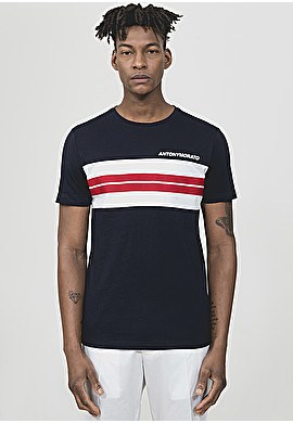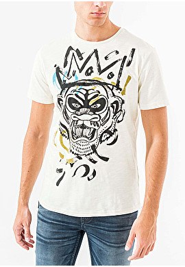 En Antony Morato también podemos encontrar camisetas que mzclan conceptos, en este el de las rayas y los dibujos. En esta camiseta blacna con rayas marinas podemos apreciar como sobresale el rostro de un tigre en la misma tonalidad que esas rayas.