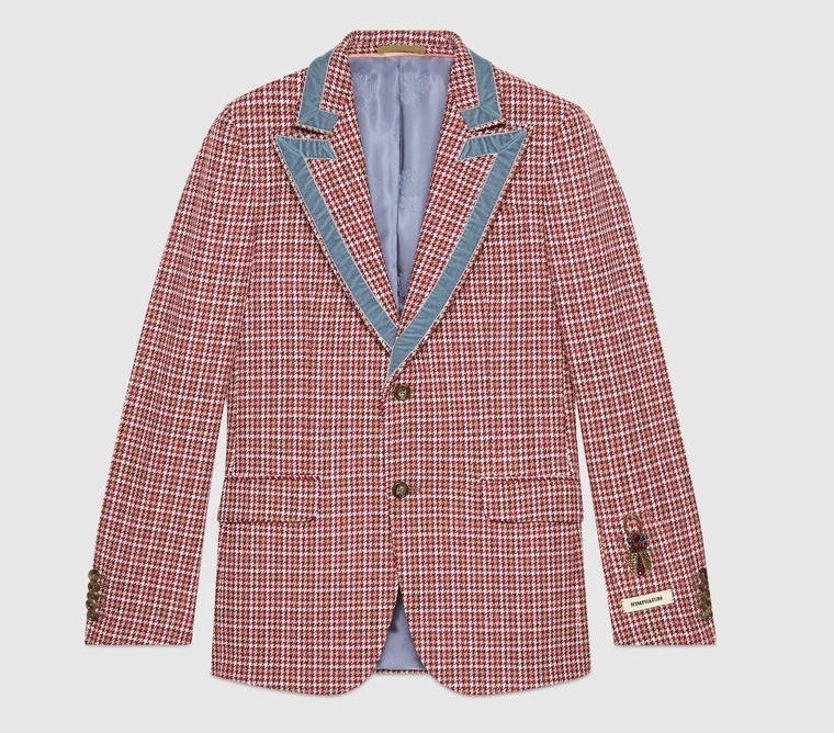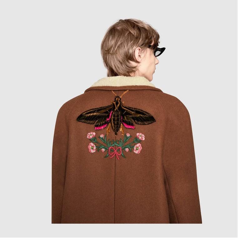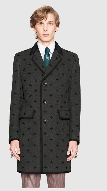 Otro ejemplo es este abrigo de fieltro de lana en color gris lleno de abejas bordadas, un abrigo de corte sastre, elegante y atemporal, pero con esa chispa de diversión que nadie como Gucci saben introducir en sus prendas, en este caso una lluvia de abejas y estrellas. Detalles como los ribetes negros que recorren todo el abrigo.