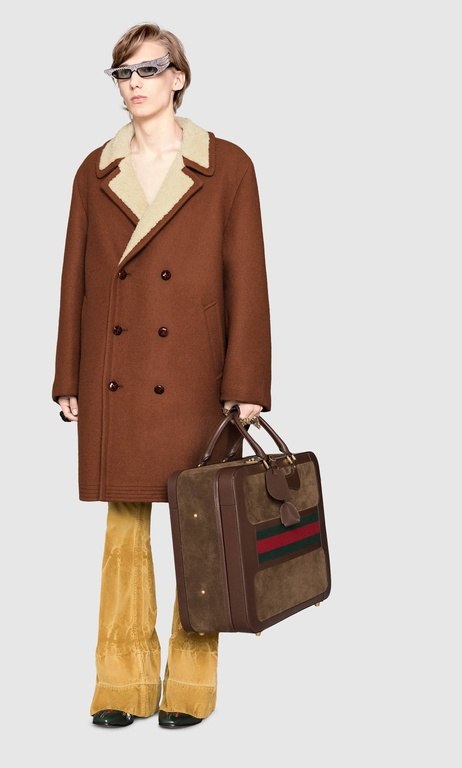 Los abrigos de la firma Gucci son realmente impresionantes, podríamos hablar de verdaderas obras de arte y fiel ejemplo de esto es el impresionante abrigo de la imagen superior. Un abrigo confeccionado en tejido de sarga de lana de angora en color camel. Un abrigo envejecido por medio de un tratamiento especial y cálido gracias a su forro de borreguillo, como guiño a la naturaleza en la que está basada esta colección.