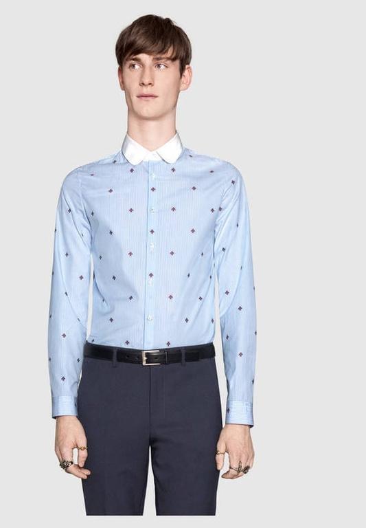 Otra impresionante camisa de fil coupé en color azul claro y con diseño de abejas en azul marino bordada por todo el tejido. Como no podía ser de otra forma teniendo en cuenta la temática de esta colección. El cuello a contraste en color blanco y puntas redondeadas.