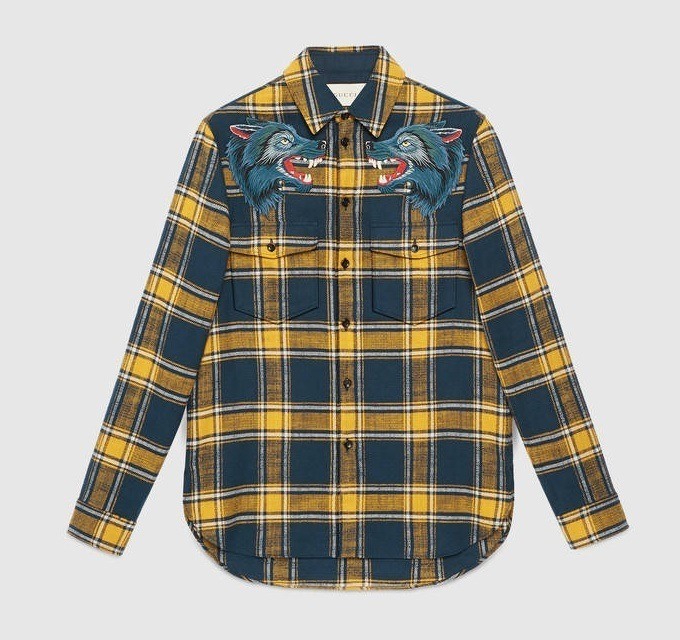 En esta ocasión, nuestro guiño va dirigido a los cánidos, con la imagen enfrentada de dos salvajes lobos. Se trata de una camisa de cuadros tipo escocés en unos potentes colores azules y amarillos, muy en sintonía con el movimiento punk. La espalda se encuentra adornada con una aplicación donde se puede leer “Gucci Animalium”.