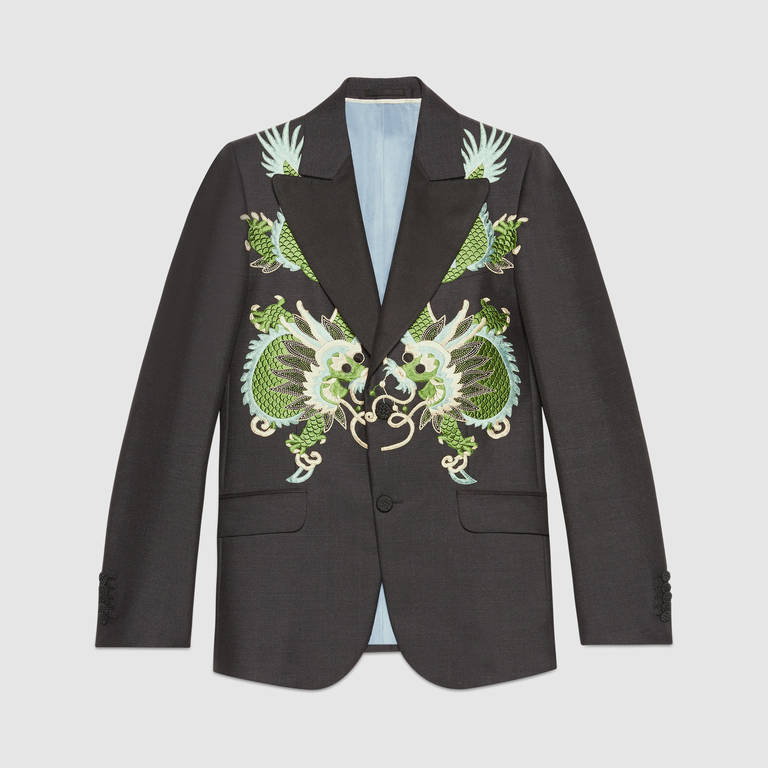 El dragón oriental y el poder que canaliza su energía, un símbolo oriental de la buena suerte y el poder. Decorar una chaqueta de lana de angora gris con unos bonitos dragones verdes bordados, sólo podía ser una idea del director creativo de la firma. Una chaqueta que también podemos encontrar en el nuevo catálogo Gucci Otoño Invierno2023.