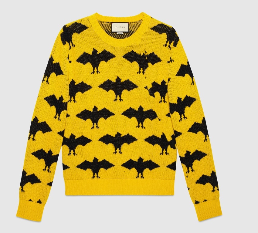 Un precioso jersey en color amarillo confeccionado en lana de alpaca, tan suave al tacto y calentito, para Otoño Invierno2023. Como guiño de la firma a la naturaleza, Gucci ha decidido dedicarle esta pieza a los grandes comedores de insectos, los murciélagos.