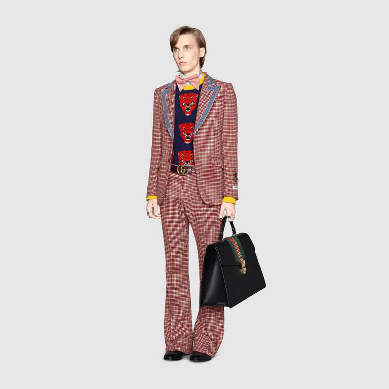 Pero tienes también, dentro del catálogo Gucci primavera verano, algunos diseños llamativos y que no son para todos, sino que tienes que ser atrevido a la hora de vestir; como este con el típico estampado de la marca Gucci.