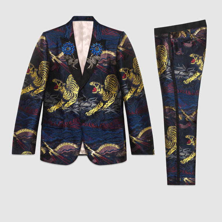 Confeccionado en lana y seda este original traje tipo esmoquin con cuello de seda, en color azul marino y con unos impresionantes dragones dorados que brillan con luz propia. Un precioso traje para lucir en un evento importante y estar perfectamente a la altura.