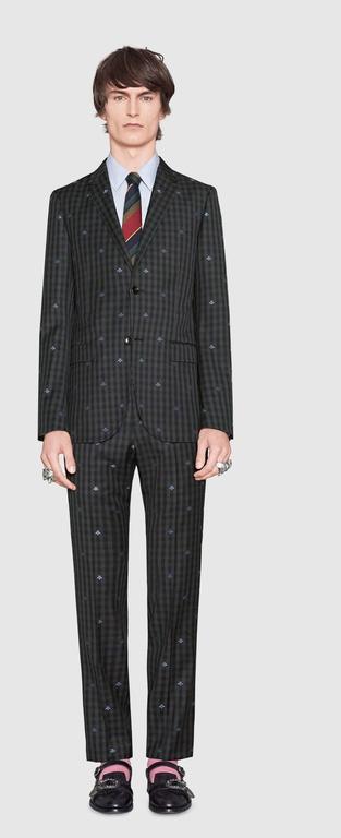 Traje confeccionado en lana con diseño de cuadros en gris oscuro y salpicado por abejas bordadas en un azul vivo y alegre. Un diseño muy especial para este traje al que han llamado Mónaco, con silueta estrella y hombros redondeados.