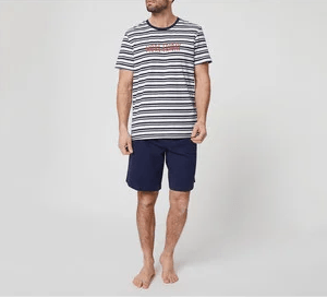 Entre los pijamas que ofrece el catálogo Rebajas Alcampo Verano encontramos juegos de dos piezas especialmente elegantes y masculinos. Es el caso de esta pijama de algodón de dos piezas, con camiseta de rayas horizontales y pantalón oscuro que arrasa. Vale 9,99 euros y es una pasada.