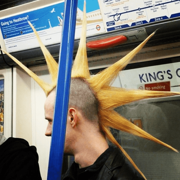 De hecho, han vuelto las crestas más extremas. Sin ir más lejos, la que ves en la foto, con pelo rapado por los laterales para dejar la cresta completa en toda la cabeza. El pelo teñido y las puntas llevan mucho tiempo y mucha dedicación. Laca, secador, cera y mucha paciencia para que las ocho puntas queden picudas y aguanten lo máximo posible. Porque ser punk rock es muy sacrificado.