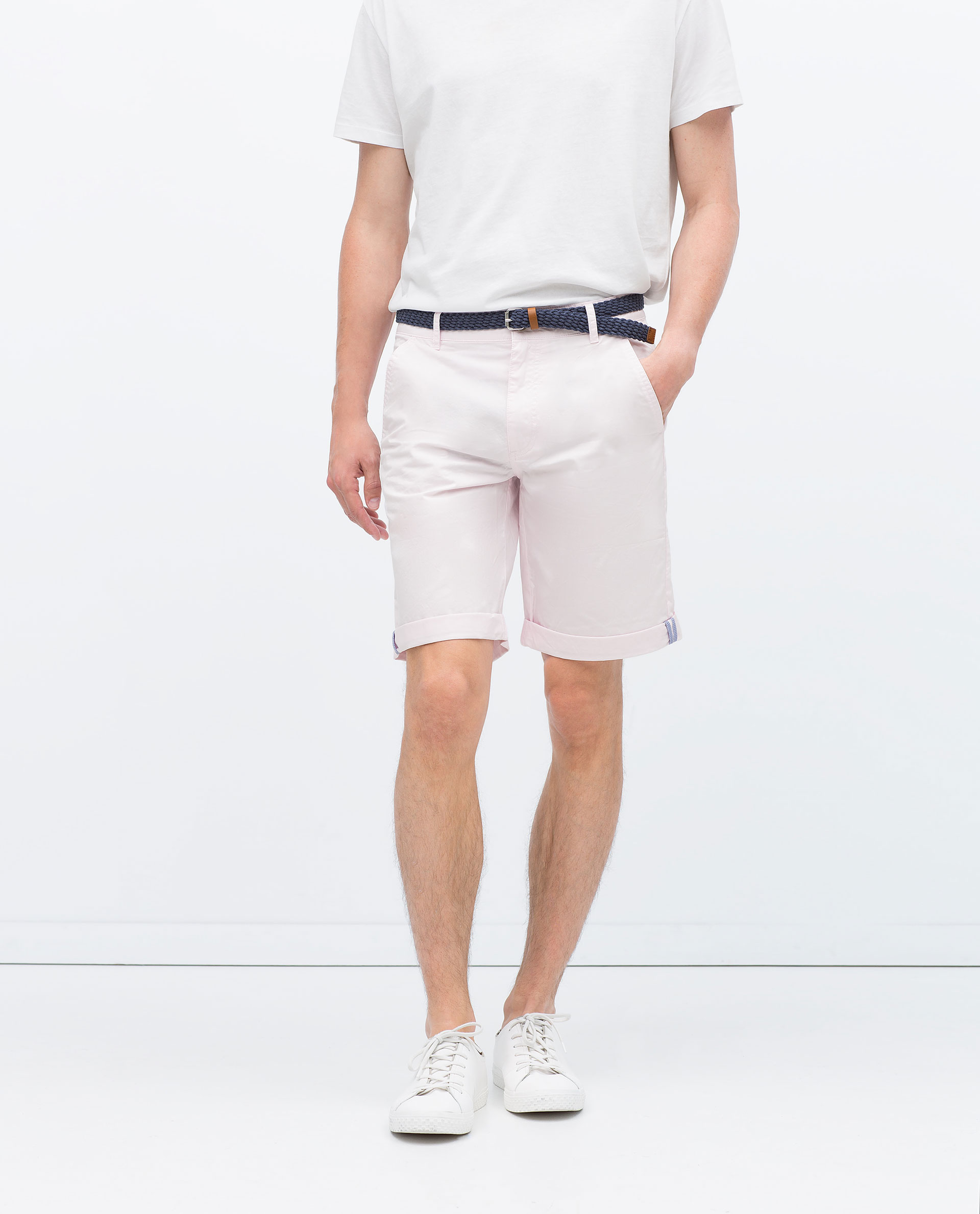 Que también tienes amigos que cumplen sus años en verano, ¡qué mejor que celebrarlo con una comilona en la playa! Y si lo que quieres es ir más o menos formal sin olvidar que estás en la playa, nada como vestir unas bermudas en rosa palo junto a un cinturón trenzado en azul marino (ideal para celebraciones más formales), y añadirle el toque relajado combinándolas con una camiseta de manga corta básica en blanco y unas deportivas blancas.