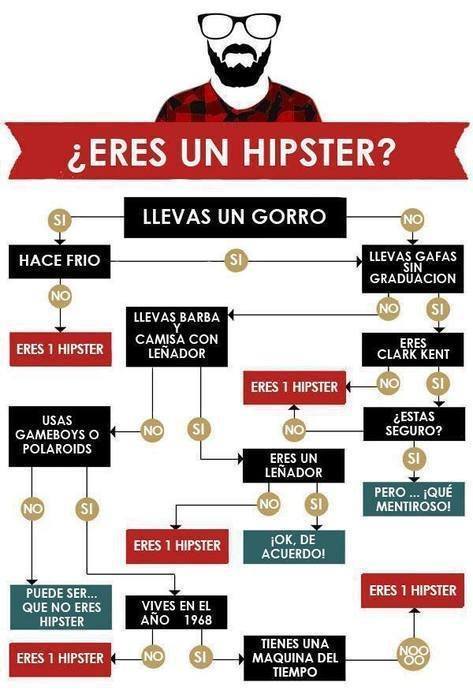 En esta pequeña infografía podrás ir viendo, a medida que vayas respondiendo a las preguntas, si eres un hipster o no. En el caso de que sea afirmativo, ya lo tienes claro. Debes buscar tu estilo y llenar tu armario con las prendas adecuadas. Verás que es un estilo que te hará diferente a los demás y que, dentro de él, podrás tener tus propios gustos, pues hay una gran cantidad de prendas entre las que vas a poder escoger.