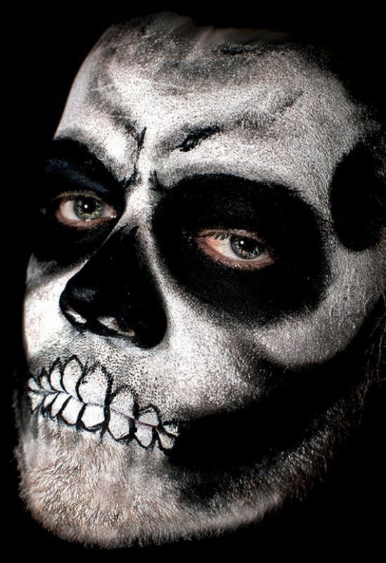 En el caso de tener una barba muy poblada y querer algo ligeramente distinto a los anteriores ejemplos. Puedes probar a maquillar los ojos completamente de negro, mientras que el resto de la cara se pinta de blanco, con una raya negra enmarcando todo el reborde de la barba y atención al detalle de pintar en negro esas líneas en la frente como si tu rostro estuviera a punto de romperse.