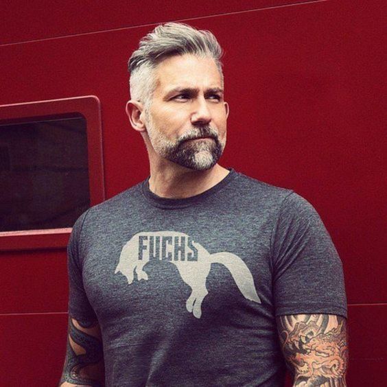 ¿Hay algo mejor que abrazar las canas? Es el caso de este look rompedor, favorecedor y altamente seductor. Undercut con escalón, tupé y bien de cera para darle forma. Se combina con una barba recortada y el look tatuado que lo convierten en uno de los mejores cortes y peinados para hombres con pelo gris y la sensación. El corte de pelo del verano.