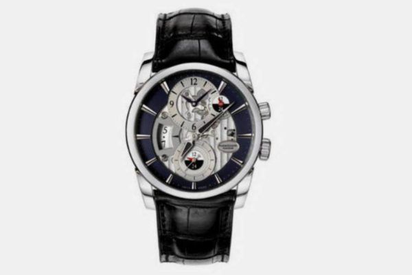 Su diámetro de 42 mm en oro blanco presenta minutos centrales, horas en la posición de las 6 en punto y segundos retrógrados a las 12 en punto. Su precio está en torno a los 30.000 euros.