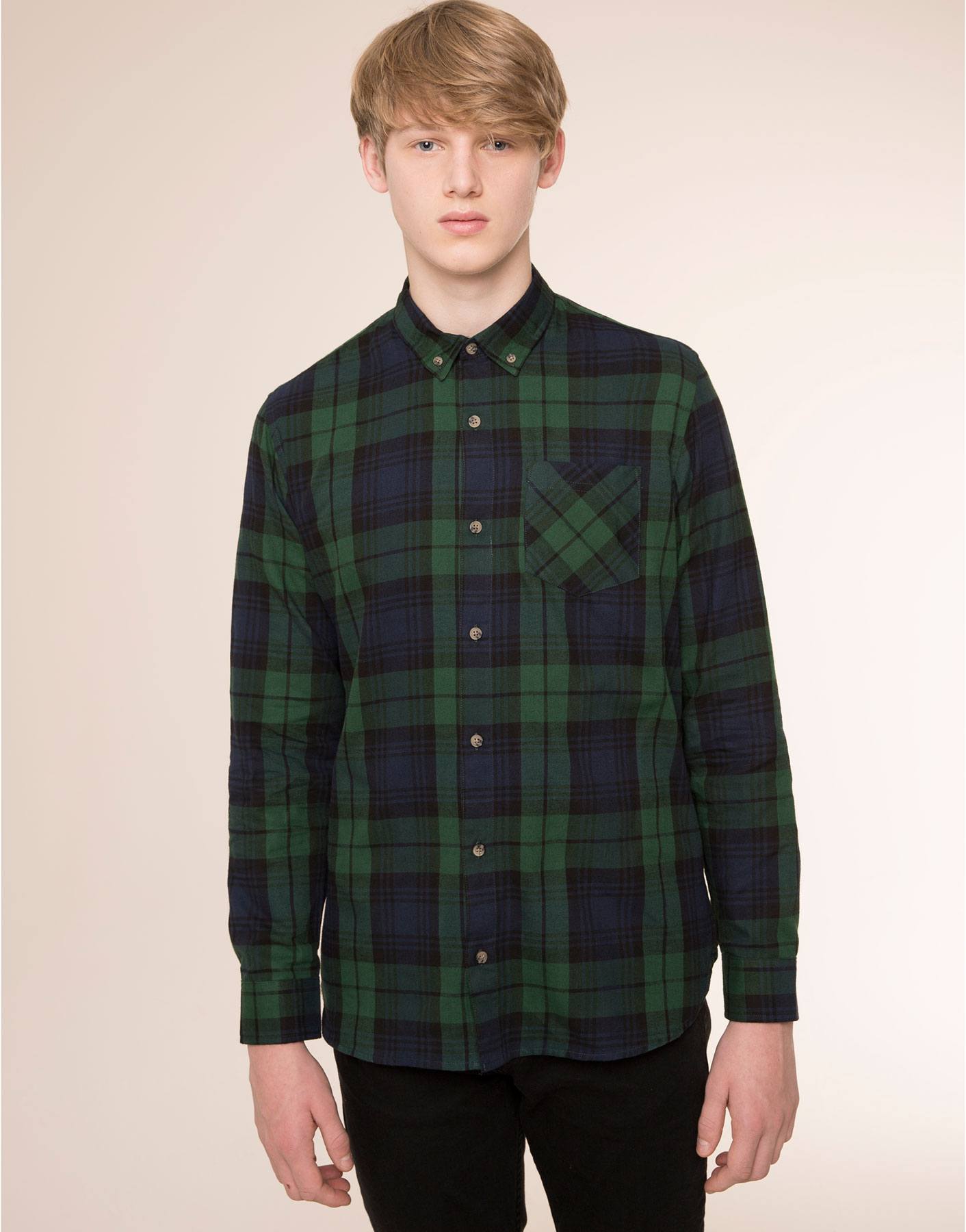Una buena idea que os queremos proponer es que elijáis una camisa a cuadros, como la de la imagen de Pull & Bear, ya que combinan a la perfección con unos jeans oscuros o incluso con un pantalón chino del mismo tono. Podéis llevarla además con una cazadora de cuero, o incluso una parka.