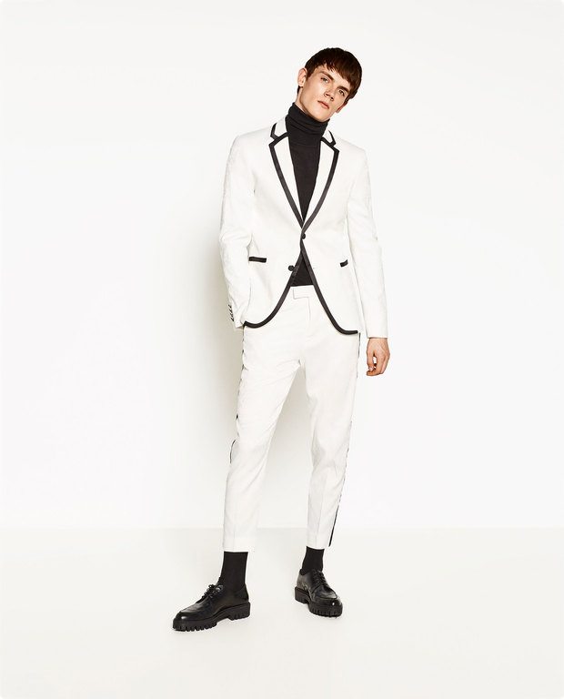 Este otro traje en blanco y de estilo sporty sorprende, y mucho, en la nueva colección de ZARA hombre para esta navidad, ya que aporta un toque más rebelde al resto de propuestas, también muy arriesgadas, claro. Si buscas un traje de fiesta diferente, esta es tu marca.