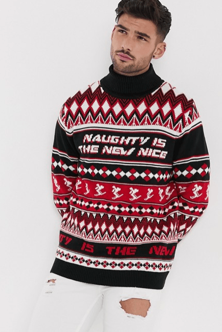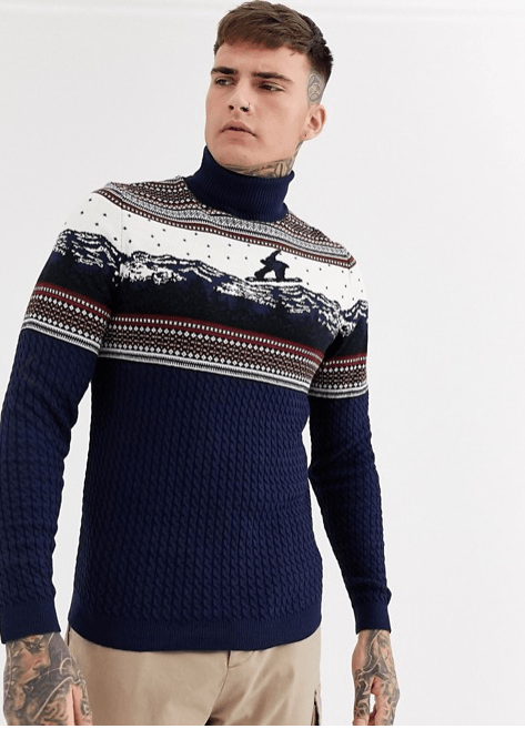 Terminamos el repaso a la Moda Hombre Navidad con este jersey navideño de cuello alto con escena de Navidad de Asos Design. Una prenda que te lleva por 32,99 euros para arrasar en Nochevieja. Cuello vuelto, skateboard en el diseño y color azul marino en el resto del jersey.