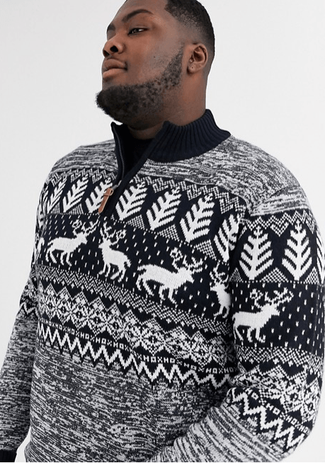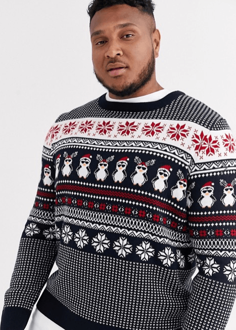 Otra alternativa de talla grande es este jersey navideño con diseño de grecas alpinas y pingüinos de New Look Plus. Lo tienes por 25,99 euros. Es divertido, cuello redondo, ribetes ajustados y corte estándar. Un jersey para ser el rey de las Navidades de la mano de la Moda Hombre Navidad.
