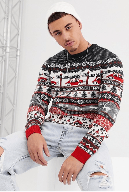 Incluso si queremos un diseño más arriesgado, tenemos la opción de este jersey azul marino oscuro con diseño navideño Driving Home de Only & Sons. Por un precio de 32,99 euros, nos llevamos toda la Moda Hombre Navidad a casa, dibujada en un jersey. Cuello redondo, ribetes de canalé y corte clásico pero imposible dejar de mirar.