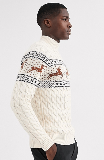 Si buscas algo más formal, la alternativa te la da este jersey navideño con cuello alto de Selected Homme. Parte de la colección responsable de la firma, con ribetes de canalé y renos navideños a la altura del pecho. Corte estándar y color blanco melange. El precio de este jersey es de 52,99 euros. Una forma de ser más navideño que nadie, sin perder la elegancia. Pura Moda Hombre Navidad.