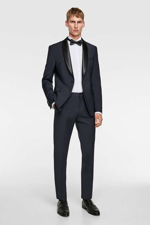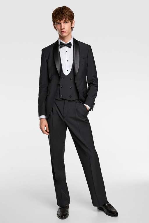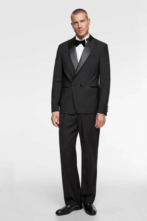 Otra alternativa que te proponemos, similar al anterior esmoquin de Zara pero con matices. Se trata de este esmoquin con solapa ancha. También está compuesto por tres piezas: blazer (99,95 euros), pantalón (49,95 euros) y camisa blanca (29,95 euros), es decir, 179,85 euros el conjunto.