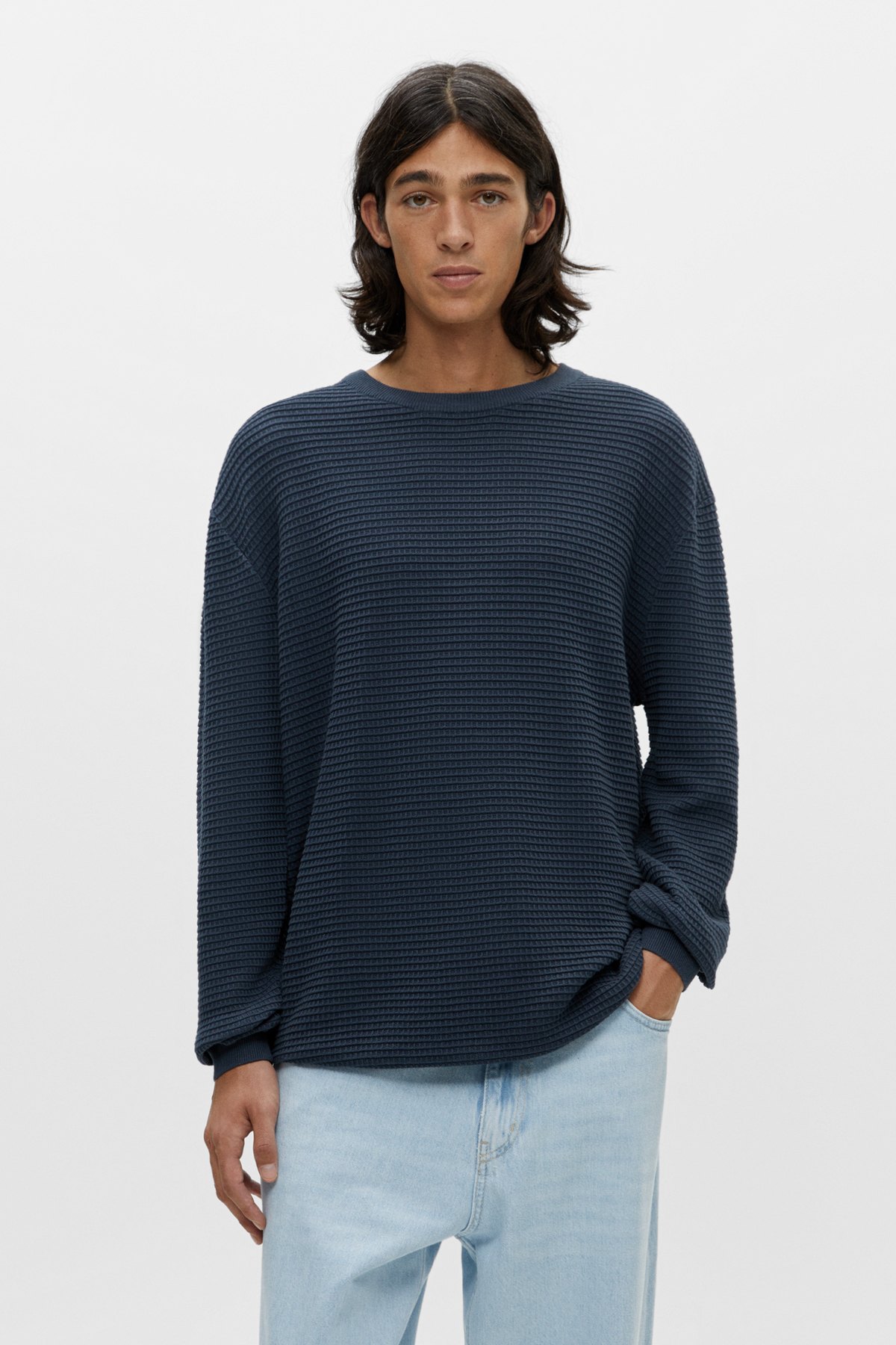 Otro jersey que destaca es el modelo de punto waffle, que arrasa en azul pero que está en más colores. Un básico para llevar toda la Navidad o el invierno.
