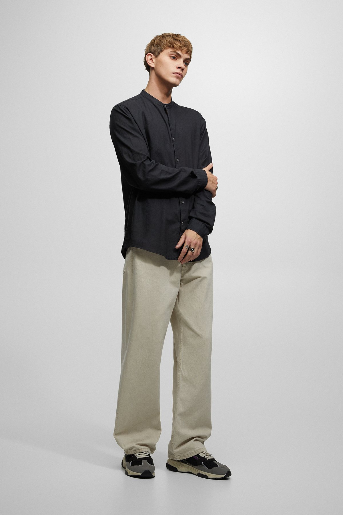 Si eres más de camisa, nada como elegir el look que ahora ves, con camisa de cuello alzado o cuello mao en negro, que puedes combinar con cualquier jean o como vemos, unos pantalones del tipo “carpenter” en color blanco roto.