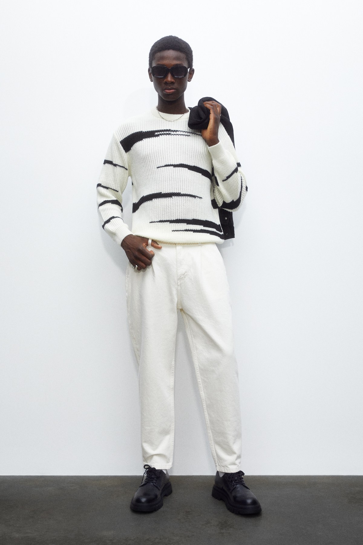 También el look de jersey de punto malla con estampado en blanco y negro y pantalones globo en blanco.