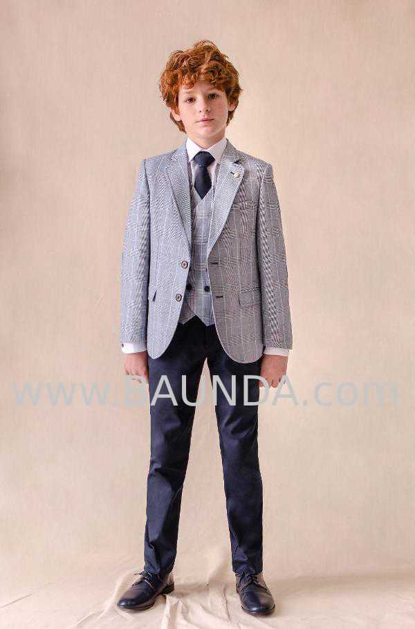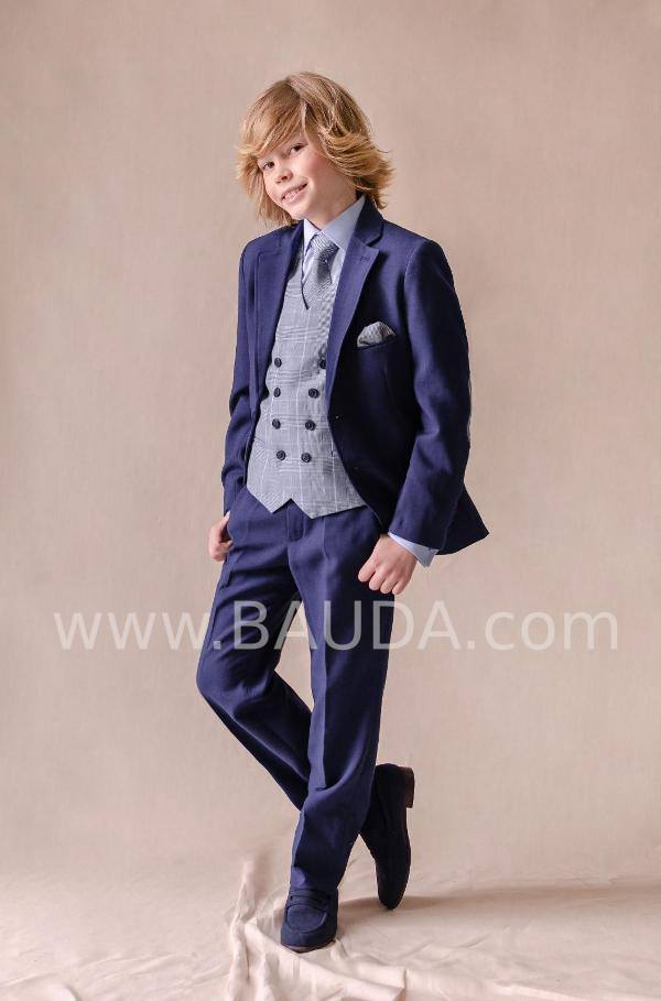 El modelo 1825 es un modelo de traje de comunión perfecto si tu hijo quiere llevar su traje combinado con una pajarita. Un traje que destaca además por su chaqueta en azul y su chaleco con detalle de cuadros.