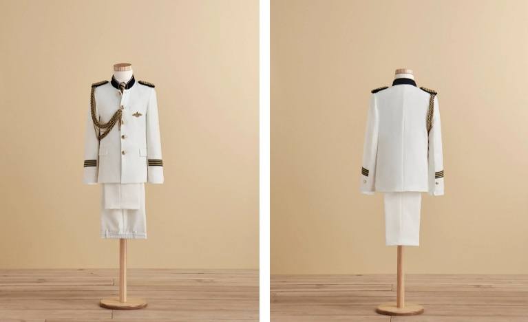 Este otro modelo recibe el nombre de Bastian y pertenece a la línea de trajes de El Corte Inglés que recibe el nombre de Coconut. Un traje de estilo marinero como los ya vistos anteriormente pero que en este caso cuenta con detalles más marcados, tal y como la cinta de nudos en uno de los brazos, los detalles en los hombros o también el escudo grabado en el pecho. El traje, en blanco, se compone de chaqueta y pantalón así como la corbata que veis en la imagen.
