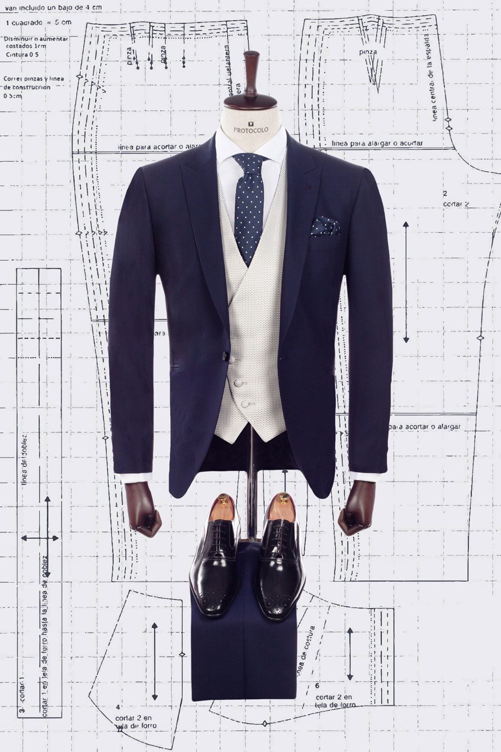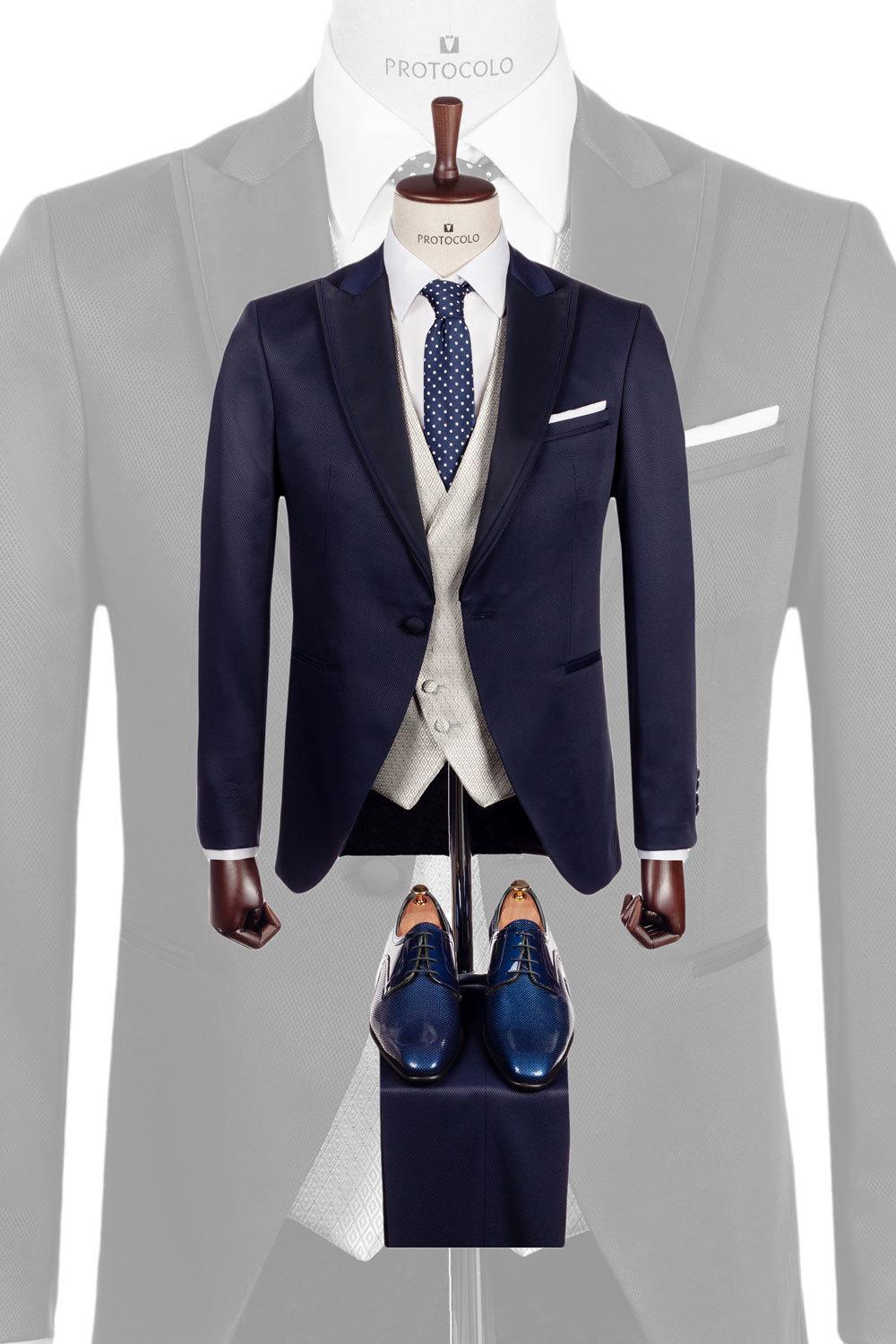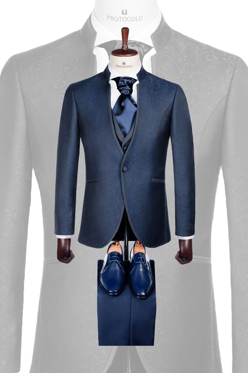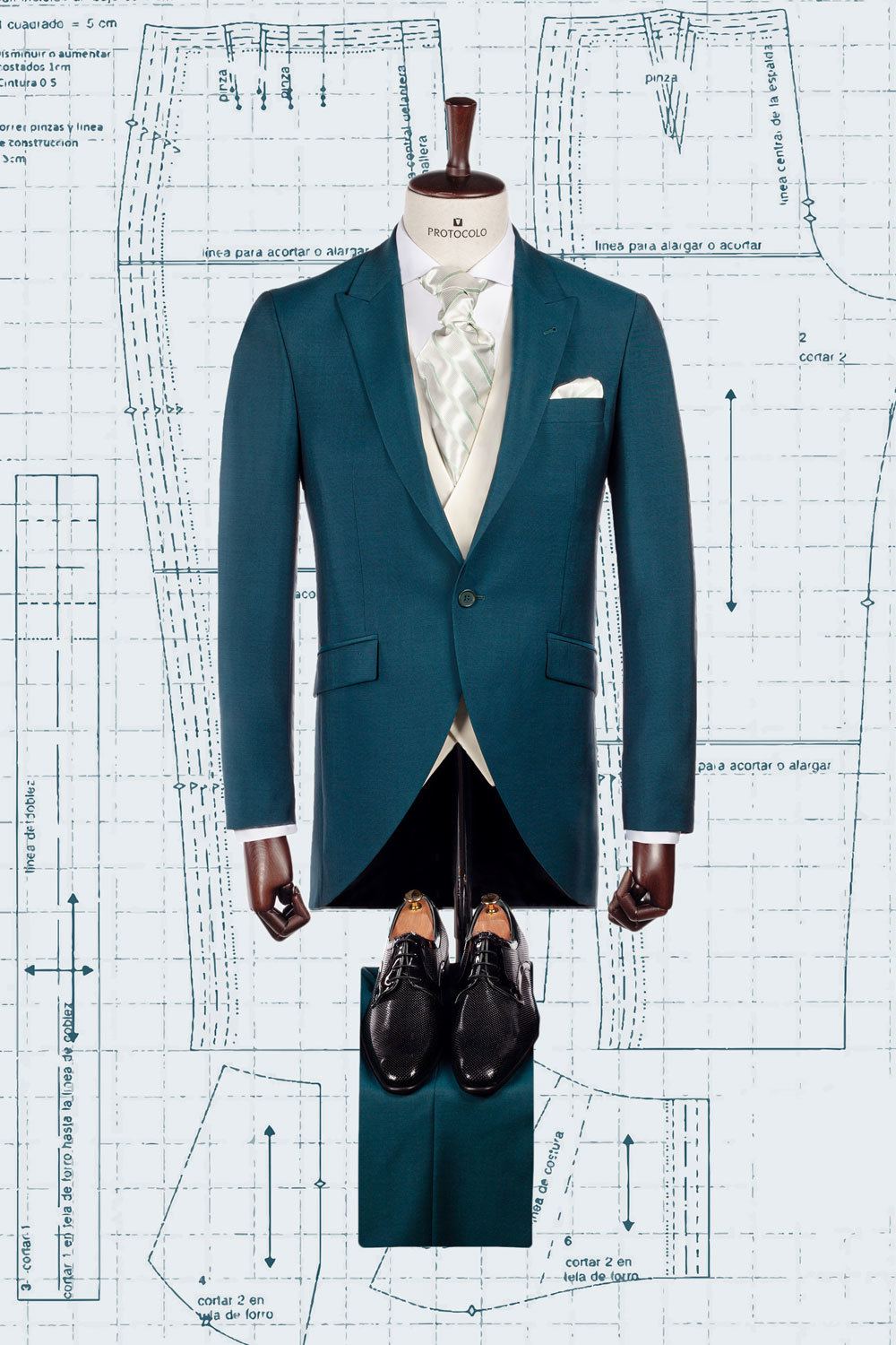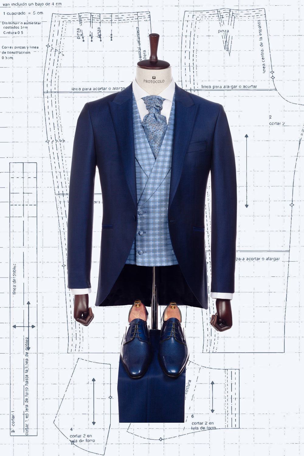 Este otro traje de ceremonia tiene un estilo clásico debido al color azul. Se trata del traje Manchester que aunque no se vea bien en la imagen, tiene un pequeño estampado. La chaqueta es una semilevita con solapas de pico y tres bolsillos delanteros, mientras que el pantalón con un corte regular y algo holgado tiene cinco bolsillos.