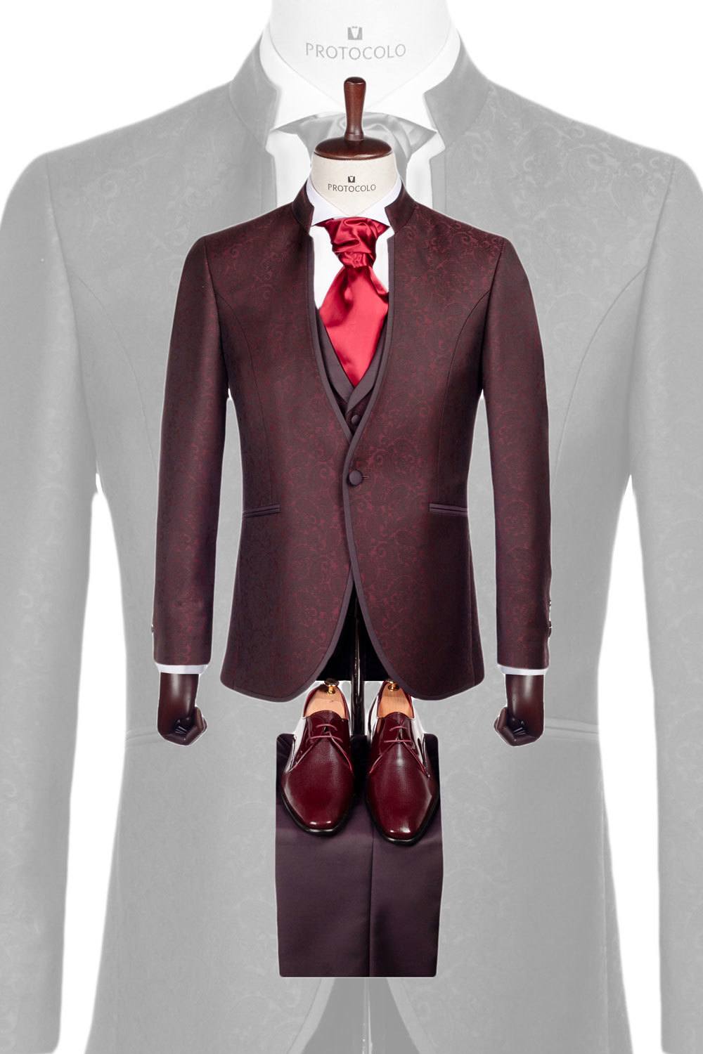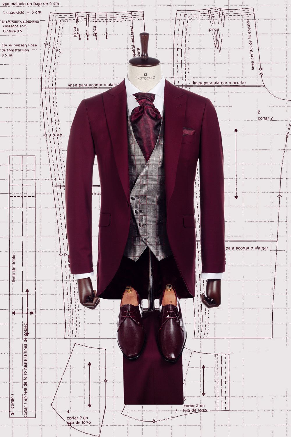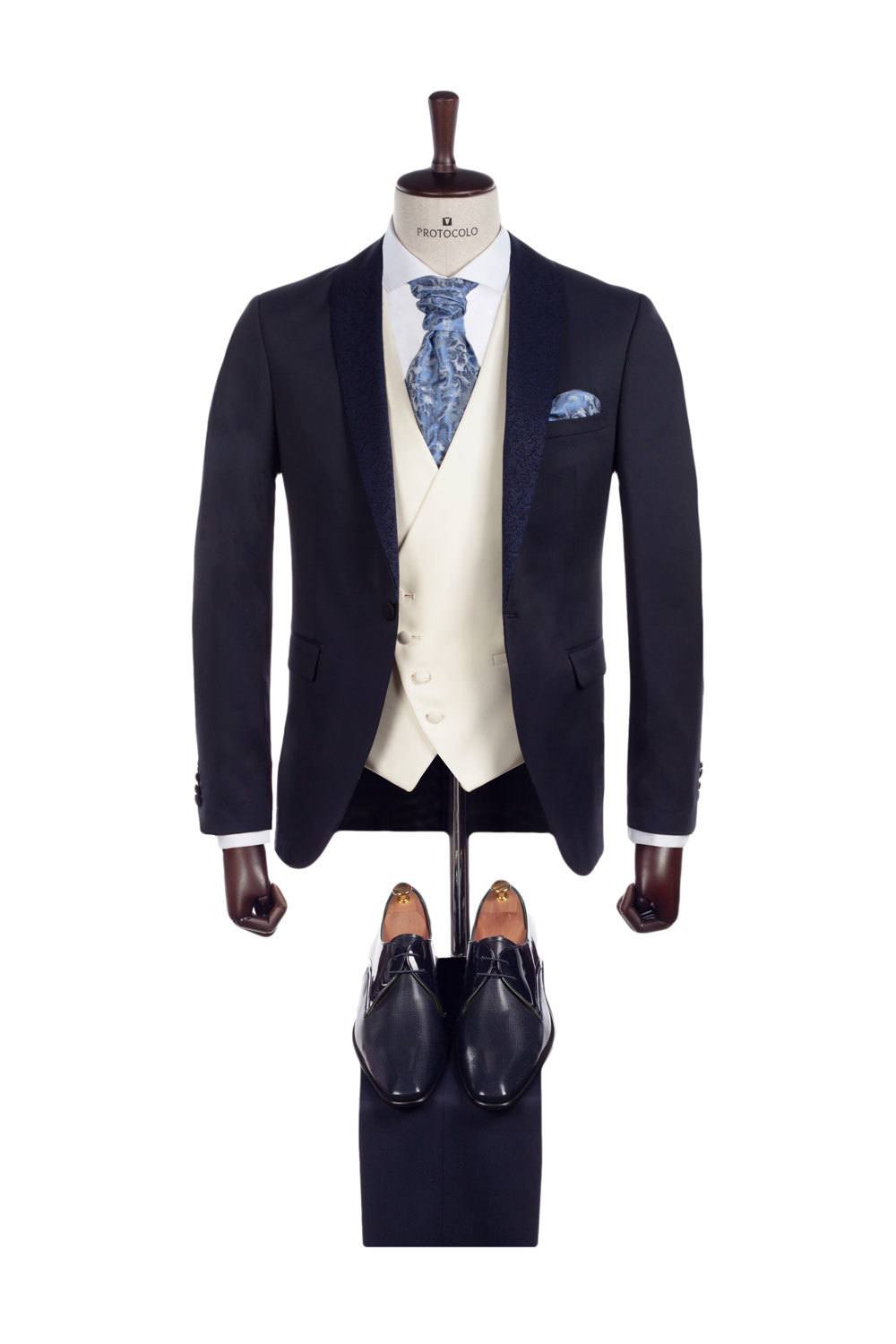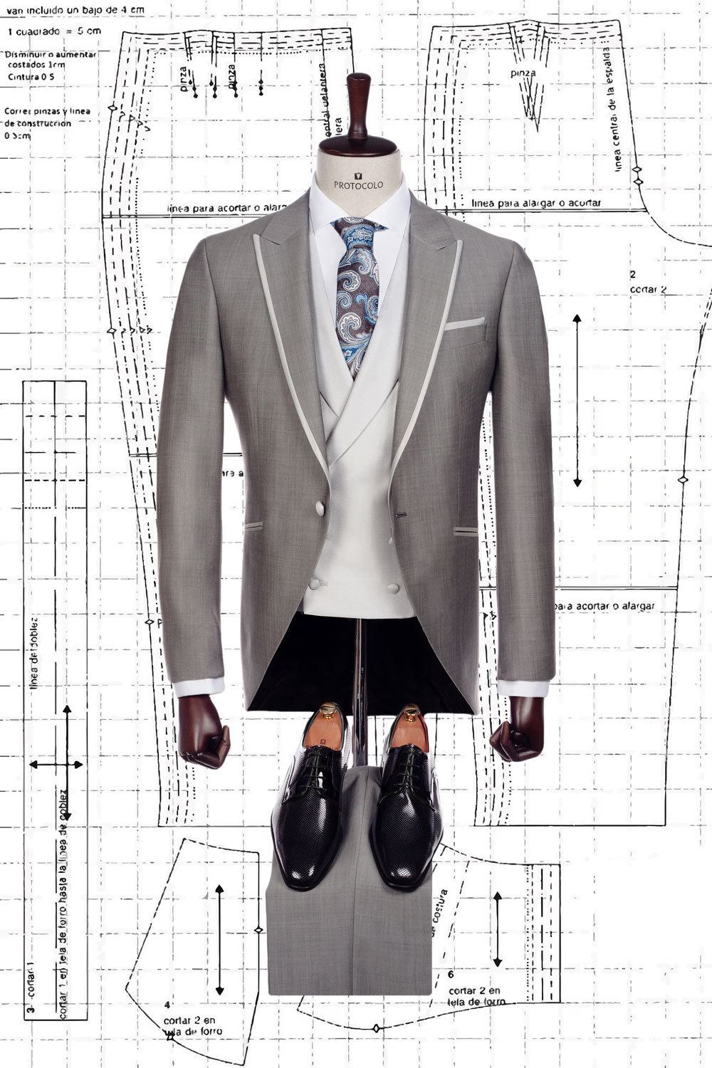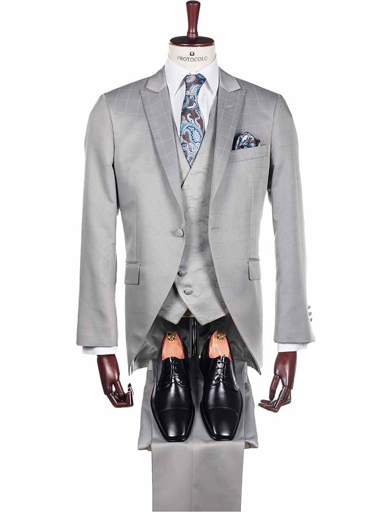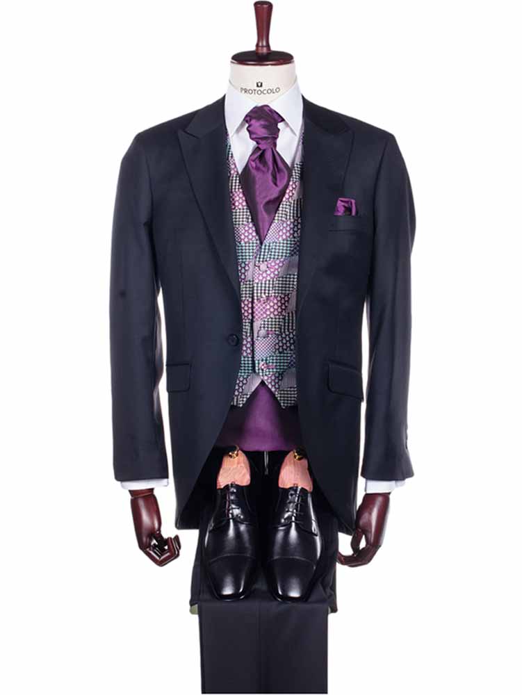 Este otro traje de ceremonia tiene un estilo clásico debido al color azul. Se trata del traje Manchester que aunque no se vea bien en la imagen, tiene un pequeño estampado. La chaqueta es una semilevita con solapas de pico y tres bolsillos delanteros, mientras que el pantalón con un corte regular y algo holgado tiene cinco bolsillos.