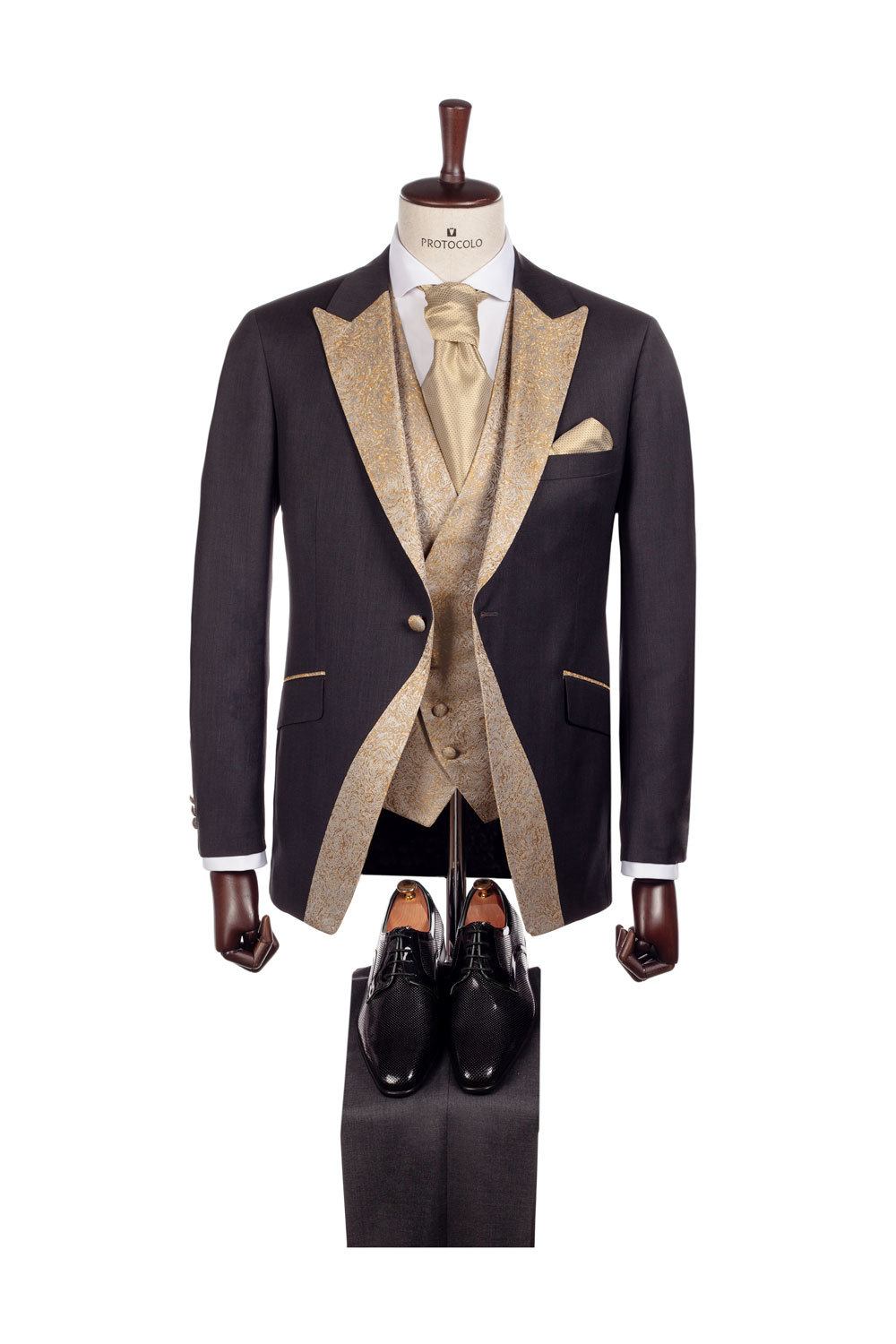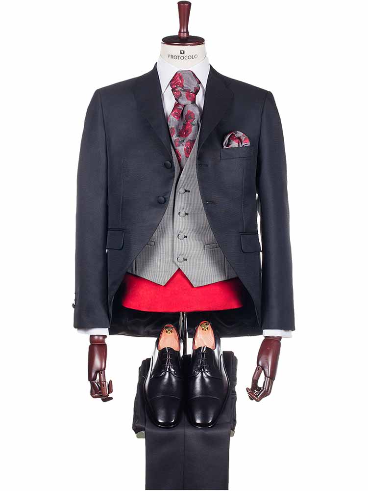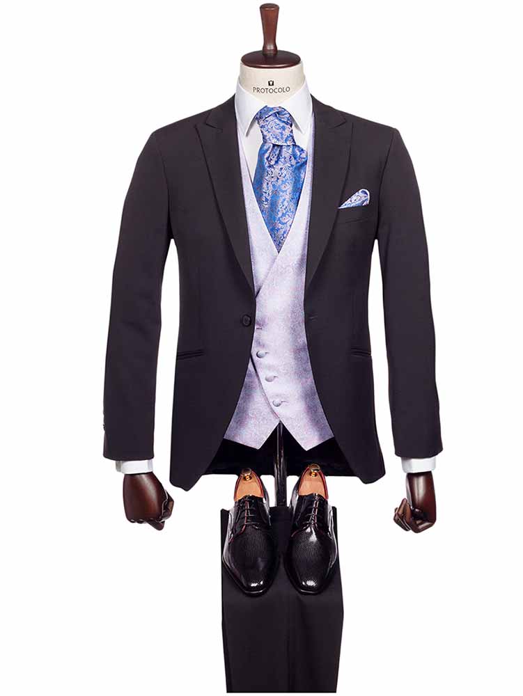 levita chaqué negro y pantalón recto gris así como un chaleco negro entallado con cinco botones en línea y dos bolsillos.