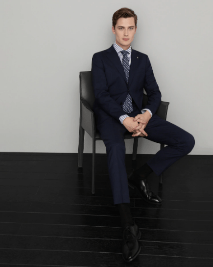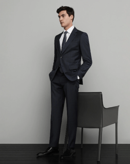 El traje Liverpool (ese es su nombre) es un traje formado por un blazer entallado con raya diplomática color azul marino, mientras que el pantalón es ligeramente más holgado.