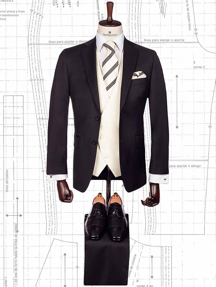 Comenzamos con un traje que destila elegancia por todos lados. Se trata del traje de ceremonia de diseño regular, es decir que una vez puesto notarás que te queda completamente recto aunque con un estilo ligeramente relajado que te permitirá realzar tu figura. Un traje de color negro llamado Manchester formado por una chaqueta que cuenta con tres bolsillos delanteros y un pantalón con cinco bolsillos. Si deseas comprar el chaleco en color hueso que ves en la imagen, tendrás que comprarlo aparte.